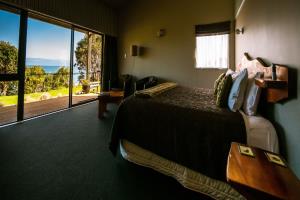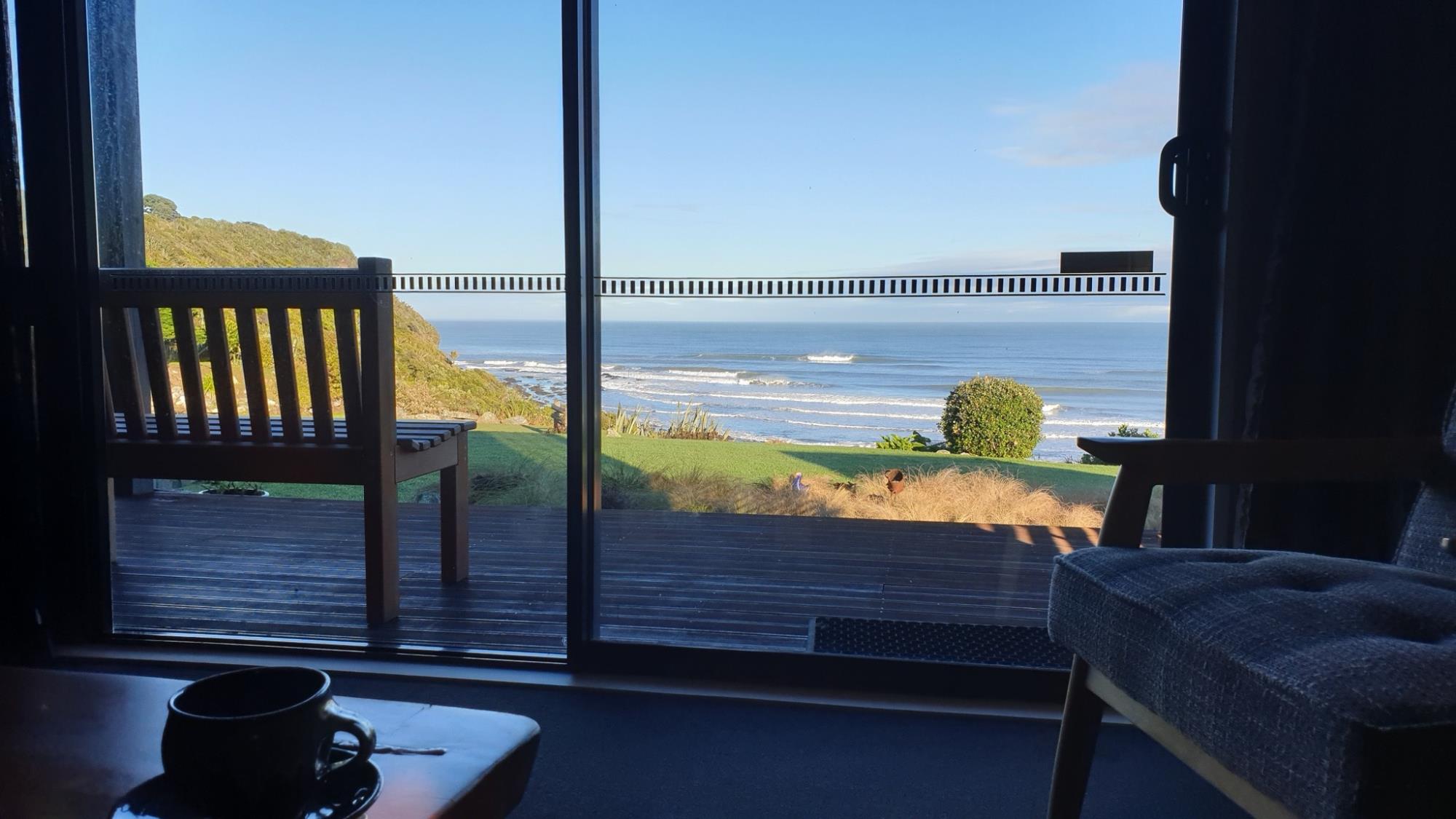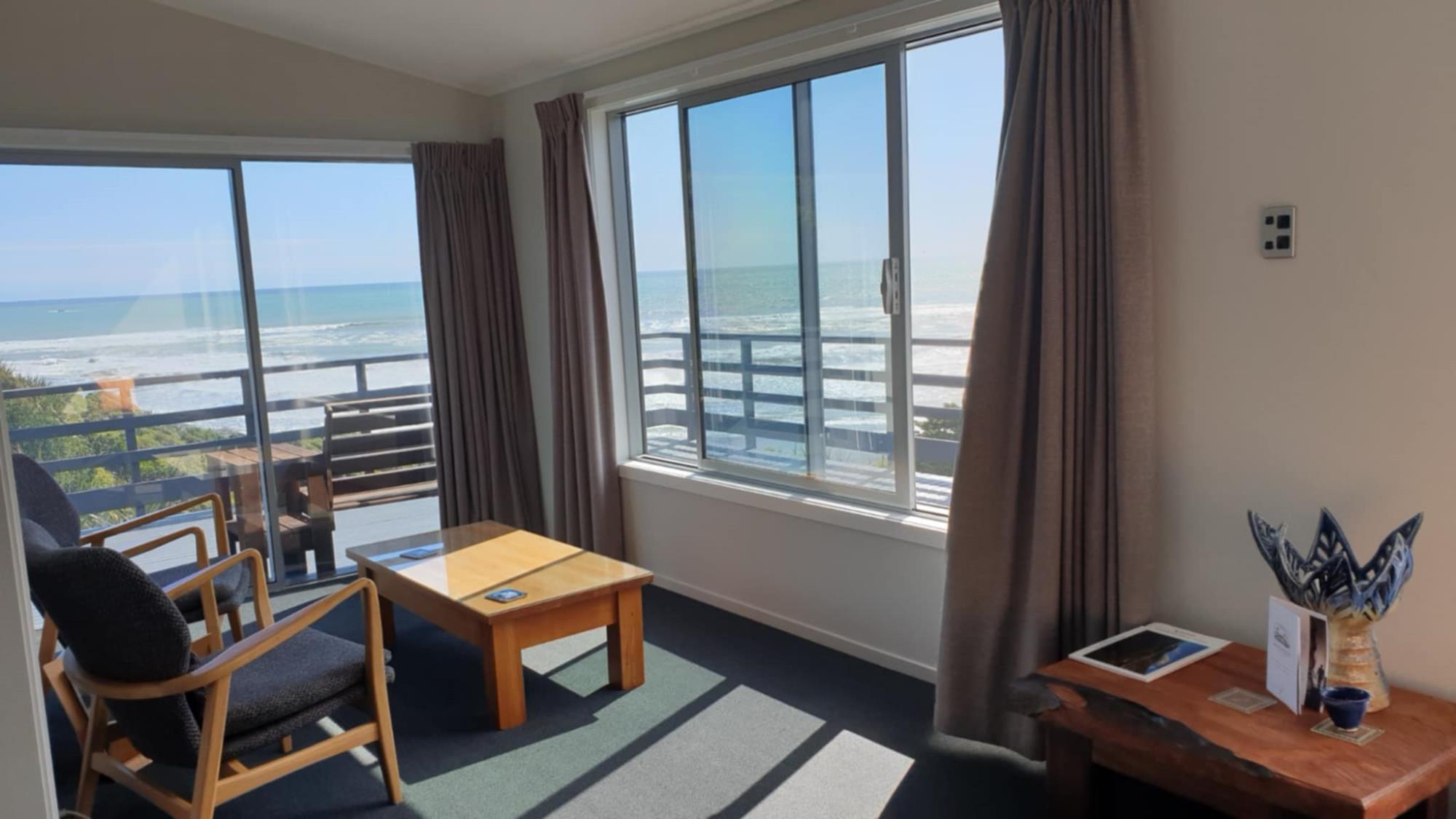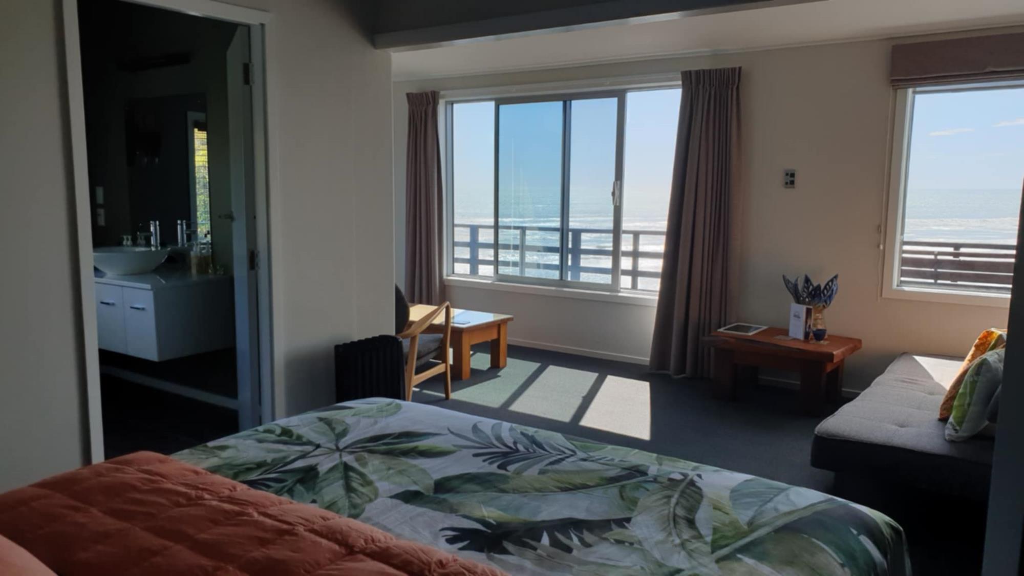 Our Koromiko room is decorated in warm colours with NZ native recycled furniture throughout and queen bed. A warm, cosy room that opens out on to the balcony, comfortable seating in the bay window or you can lie in bed and watch the rolling surf. Ensuite bathroom with shower. The smaller of our rooms but still offering comfort and style and fantastic views overlooking the Tasman Sea. Rate includes breakfast.