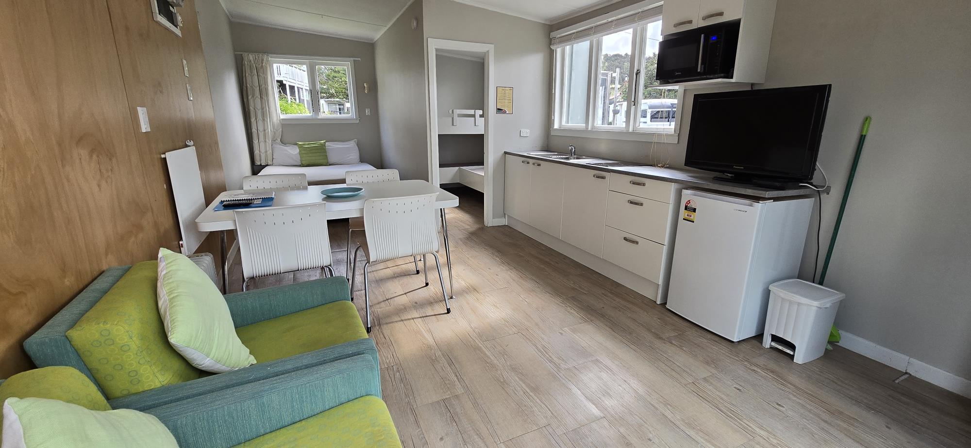 Karaka - Non-Waterfront Kitchen cabin with a fully equipped kitchen. There is 1 room with 1 x Queen bed & 2 x singles in a bunk set with a trundler underneath in 1 room. There is another room with 4 singles in built-in bunk style. All beds have a bottom sheet and pillows. You need to bring your own linen or hire linen for $10 per bed set. Extra Adults $24 & Extra Children $15 per night