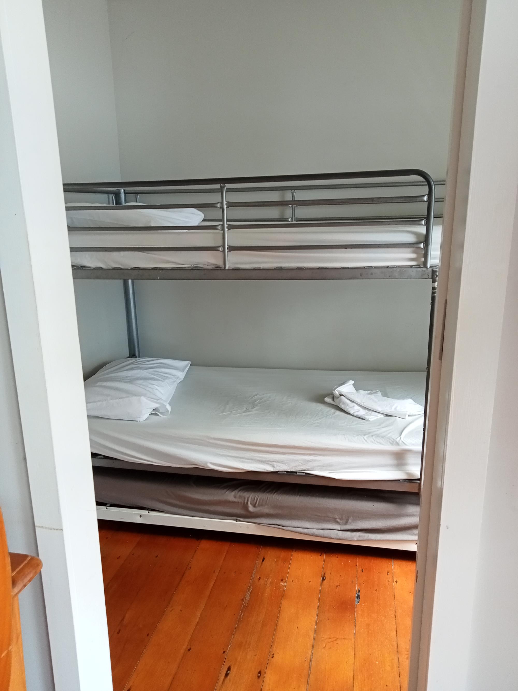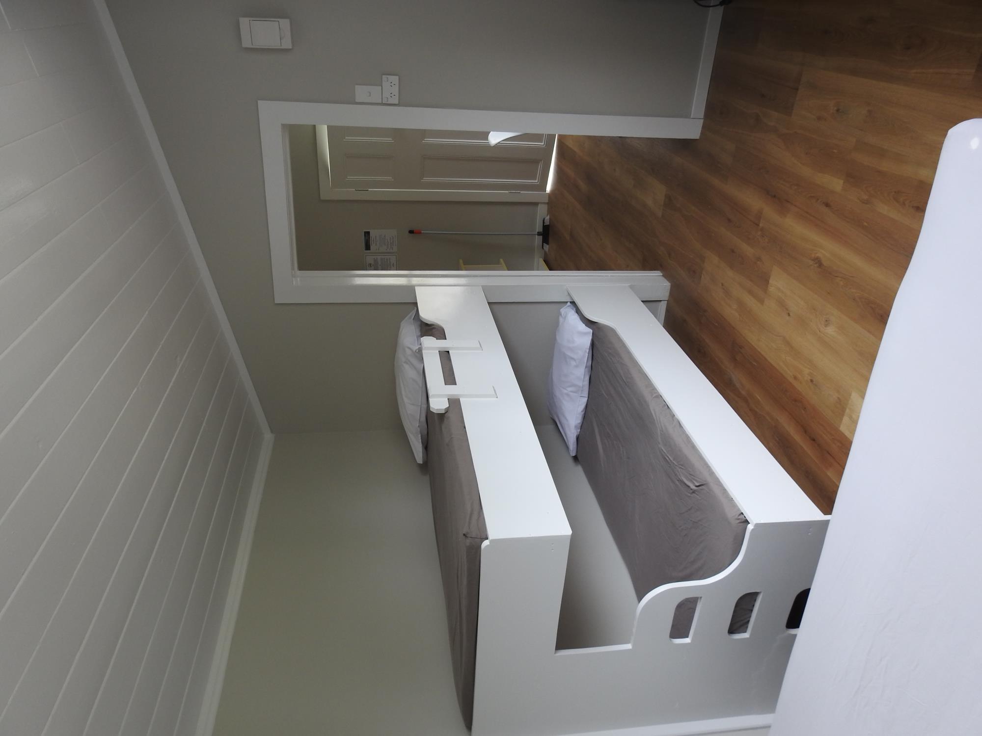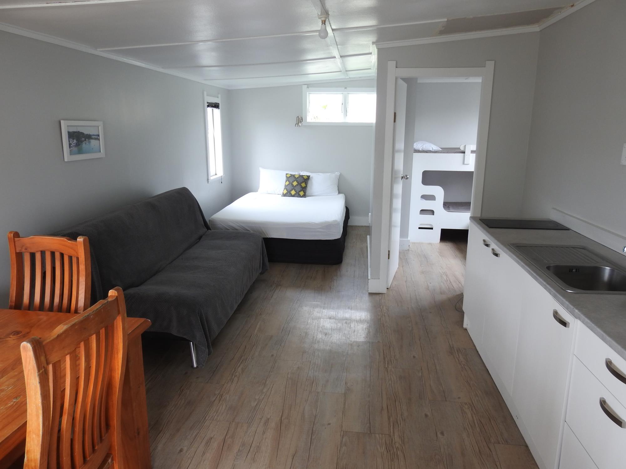 Bay - Waterfront kitchen cabin with fully equipped kitchen. 1 x queen bed, 2 x singles in a built-in bunk style at the back of the main room and 2 x singles in a built-in bunk style in a small separate room at the back of the cabin. All beds have a bottom sheet and pillows. This cabin also has a sofa bed so could sleep another 1 or 2 people. You need to bring your own linen or hire linen for $10 per bed set. Extra Adults $25 & Extra Children $15 per night