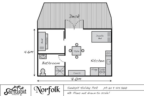 Norfolk - Self-contained cabin - located on the waterfront – Sleeps 5 - North-facing deck. Open plan main room. Bathroom with shower & toilet, . Beds 1 x King Sized Bed in Main Room 2 x Single Beds in separate room. Trundler under bunk. The King bed is fully made-up including sheets, blankets and towels. Singles have a bottom sheet and pillows including pillowcases. Bring your own linen or book linen hire at $10. Extra Adults $25 & extra children $15 per night