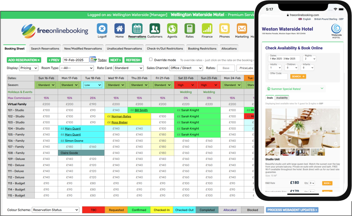 freeonlinebooking's booking sheet is designed to make day-to-day management simple and flexible. Make one-off changes to rates, minimum stays, and availability directly on the calendar, override rules for specific dates, and respond quickly to demand as it changes. It's an intuitive, powerful tool that gives you complete control over your bookings, day by day.
